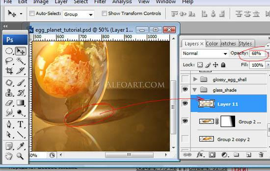 7、载入玻璃蛋选区,然后在玻璃蛋图层下面创建一个新图层,并填充选区,最后调整图层的填充值为0%,如图所示。