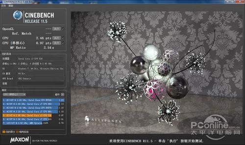 CineBench R11.5为目前最新版的Cinebench系列测试软件,它采用了3D设计软件CINEMA 4D的3D引擎,支持多线程同时运算,可以用来评测多核处理器的效能。