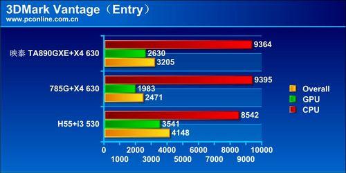 在3DMark Vantage测试中,我们选择了Entry档进行测试,从测试结果来看,除开驱动程序对3DMark Vantage测试软件有优化的H55平台以外,890GX芯片组的映泰 TA890GXE主板GPU性能明显优于785G主板。