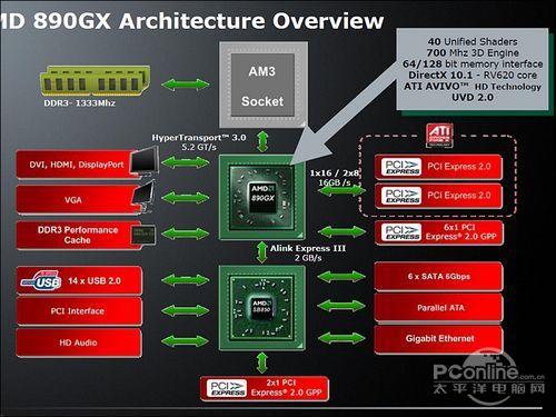 890GX芯片就是今天的主角,它是AMD发布的第一款“8”字头的主板芯片组,同时,它的规格也比前辈790GX更高,例如将除显卡外的PCI-E通道规格也全都提升到了2.0规范,速度提升了一倍,使得USB3.0接口的速度可以得到最有效的发挥,当然,其他的外接设备也能够因此而获益。