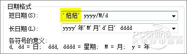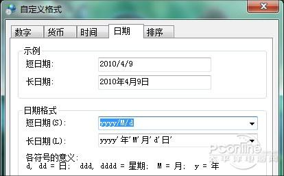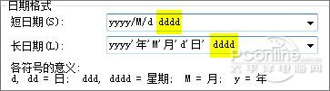 其实除了这种标准称谓外,Win7还为我们提供了另一种口语化称谓,即“周一”、“周二”等,需要时只需将代码“dddd”替 换为“ddd”即可。此外代码的位置也可以自由调整,比如我们完全可以根据喜好将其放置开头。