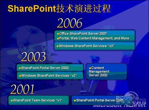 微软的SharePoint平台开始于2001年,最初名称是SharePoint Team Services,从名称上我们就不难看出这个产品是面向小组协作的一个WEB工具,从功能上讲比较单一,而到了2003年,微软发布了office 2003,微软扩展了office到服务器端,正式发布了Windows SharePoint Serveices 2.0和Office SharePoint Portal Server 2003,其中,前者是集成在Windows Server 2003中的基础服务,提供了对Sharepoint功能的基础支持,本身也提供了对小组协作的功能,而后者是基于SharePoint Serveice的一个专门用于企业信息门户创建的服务器程序,这一点从他的名字上就能看得出来。