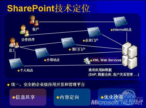 而另一方面,从这个图上,我们也可以看到微软SharePoint平台可以搭建多种Web界面,包括个人站点、小组站点、部门门户、企业站点以及Internet站点等,不同的用户群可以在严格的内容定向规则下在体格平台上找到自己所需要的信息服务,而这里所说的信息服务,并不仅仅局限于简单的web页面发布,还包括了工作流信息、小组协作文档等,SharePoint还能够与微软旗下的其他软件如Outlook、OCS等结合,带来全方位的办公自动化体验。