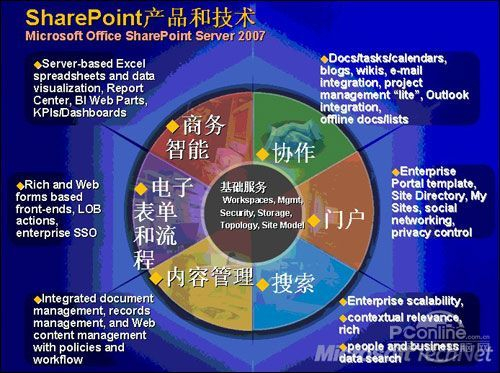 到了Office SharePoint Server 2007时代,Sharepoint平台的功能已经基本成型,下面的这张图表明了其功能,除了基本的小组协作功能和门户建设功能之外,其还能够提供企业信息整理和搜索、内容管理、工作流设置以及商务智能的功能。而即将发布的Office SharePoint Server 2010,则是在2007版本上的性能加强,增添了网站对于视频、音频、Silverlight的支持;实现了与Office办公软件的深度整合;开发人员可以在SharePoint Server或Office客户端中连接商业数据或Web服务等新的功能,但大体框架没有太大变化。