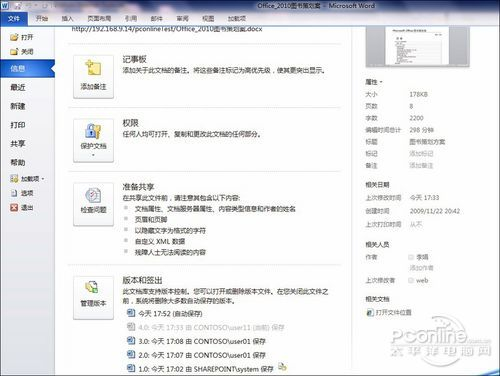 Office SharePoint Server 2010有很强的版本控制功能,点击库中的文档打开之后,点击文档的“文件”选项卡中的信息“选项”,你就会看到该文档的相关信息,其中管理版本项清晰地记录了该文档历次修改,点击其中的条目可以打开之前的草稿。