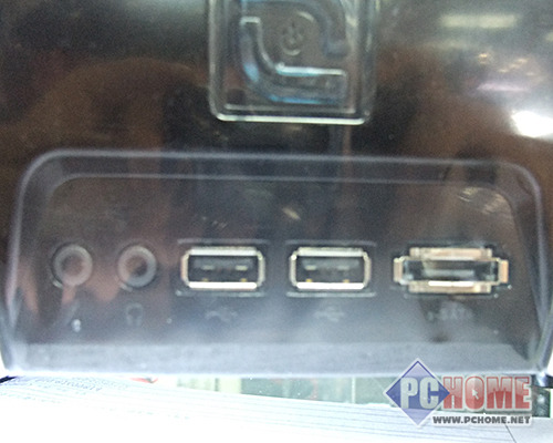 机箱面板的中间部分是机箱的电源按钮,硬盘指示灯组合。机箱的整个外板使用了亮光喷漆的制作工艺,但这种设计会较容易留下指纹在上面。机箱的下半部分有2个USB外置接口、1个前置eSATA接口和音效I/O接口。