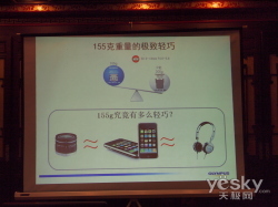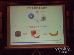 讲解人员很形象得为我们展现了155g这个分量的具体概念,可读者至此会有疑问,155g又代表着什么呢?是了!眼尖的你并没有看错,155g就是此次发布的M9-18mm的极致轻盈重量,经常举着大炮的你是否已经感受到了它的魅力呢?