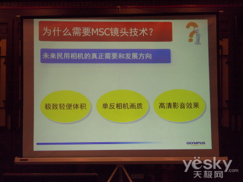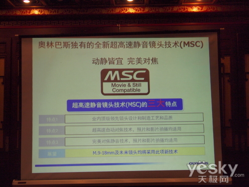 理解的介绍之后,自然很顺利的过渡到介绍新技术环节,奥林巴斯用最干练的文字概括了MSC的三大特点,相信各位在电脑前阅读此篇报道的朋友也能够看清图中文字,笔者也就不再重复了。
