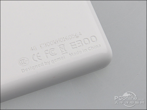 歌美E300的USB接口、耳机孔以及挂绳的孔分布在机身下侧,而MIC孔和复位孔则设计在机身左侧下方。背部的下方有一个锁键。有别于一般MP3和MP4,歌美E300的一些相关信息及SN码是刻在机身背面的,由此可见其精致程度。