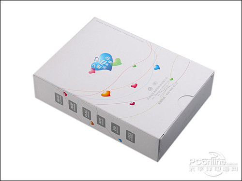 歌美E300采用硬纸质包装盒,以白色为主色调,其上的图案精致可爱,中间的产品窗口,能通过透明的塑料薄膜看到歌美E300的“庐山真面目”。