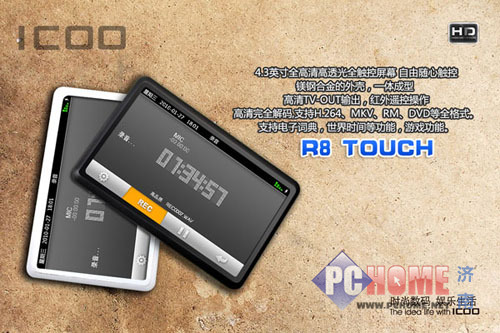 ICOO R8 touch拥有炫酷UI和全高清播放两大特色,同时镁钢合金的外壳也为其增色不少,窄边框的设计让正面的4.3英寸屏幕显得更为突出。作为一款全高清产品,R8 touch兼容主流的H.264编码,支持主流的RMVB、VOB和MKV等多种视频格式,并具备高清视频输出功能。由于配置了遥控器,在远距离操控时更加方便。除此之外,R8 touch还支持游戏、电子词典、世界时间等丰富实用的附加功能,给您带来多方面的娱乐享受。