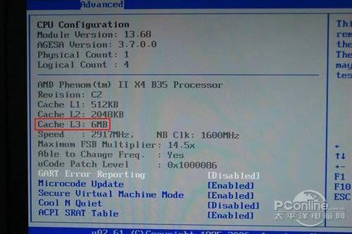为了保证“开核开缓”完全成功,我们再次查看BIOS中的CPU设置选项,此时之前被屏蔽的L3也已被打开,数量显示为“6MB”,加上已经打开的第四颗核心,我们手中的AthlonII X3 435在昂达A88GT/128M魔笛版的帮助之下已经“升级”为了高档次的“PhenomII”处理器。