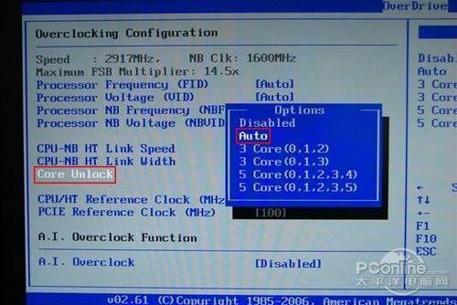 开机后按“Del”键进入BIOS选项,在“OverDrive”中找到“Core Unlock”项,一般情况下选择其中的“Auto”值,保存并重启,我们就可以完成对CPU的开核操作了。