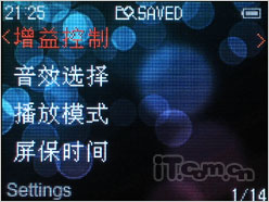 歌美恋曲E300的系统设置功能选项丰富,从右下角的数字可以看到有14种之多,包括有各种功能的参数设定,还有背景光、语言、自动关机、屏保等基本的功能。