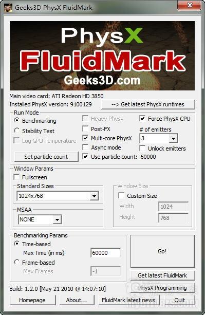 PhysX FluidMark今日升级为1.2.0版本,最大变化当属加入了对多核心处理器(Multi-core PhysX)的支持,也反映了该程序的多线程特点,包括主界面线程、渲染线程、一个或多个PhysX线程。