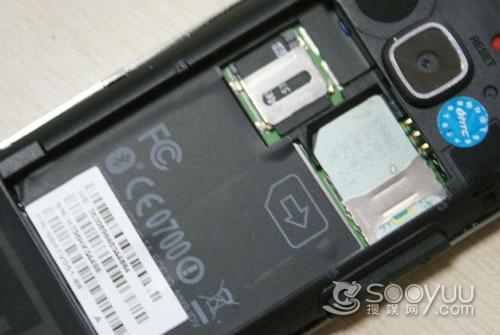 打开后盖,我们可以看到该机采用了一枚1450mAh(官网标写1300mAh)的锂离子电池,在测试期间,该机基本上保证两天左右的待机时间没有问题。取下电池就可以看到SIM卡插槽和扩展卡插槽,从这个设计看,ihtc HD-5是无法实现扩展卡热插拔功能了。