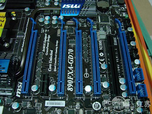 微星 890FXA-GD70主板提供了4条PCI-E 2.0 X16显卡插槽,以及1条PCI-E 2.0 X4插槽,1条PCI-E 2.0 X1插槽和1条PCI插槽,在扩展性能方面,非常强大。