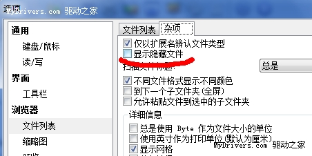 在Windows中查看隐藏文件是很不方便的,在XnView中,我们只要单击“工具→选项”,在弹出界面中选择“浏览器”的子项“文件列表”,再勾选其选项域中的“显示隐藏文件”。回到XnView浏览器的主窗口,隐藏文件都一一显现了,如图所示。