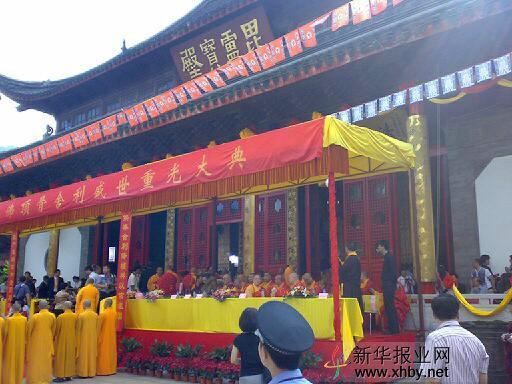 8点40分,记者在现场看到:现场的僧众和信徒一直高唱“南无本师释迦牟尼佛”,钟磬悠扬,场面庄严。