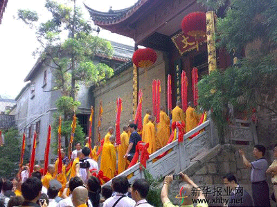 8点40分,记者在现场看到:现场的僧众和信徒一直高唱“南无本师释迦牟尼佛”,钟磬悠扬,场面庄严。