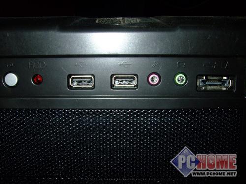 该机箱前置接口丰富,提供两个USB接口、音频接口以及e-SATA接口。位置则是提到了机箱的上部,这样方便喜欢把机箱放在电脑桌下面的用户使用。
