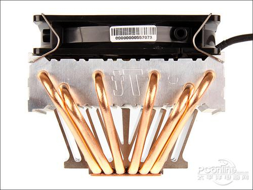 Tt 凤凰S400散热器采用了6根纯铜散热管,热管在散热鳍片中呈波浪状一字排开,可以保证散热鳍片的热量分布均匀,同时顶部的热管封闭也采用了保护套遮罩,避免了裸机运行时手部接触散热管时被烫伤的意外。