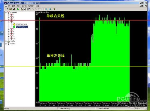 简单的测试我们发现靠近电源接口的天线信号强度要远远高于另一边的,如果在远距离无线桥接的时候,高增益天线安装时就要注意选好接口了。