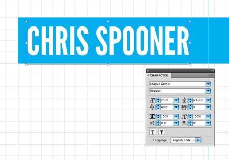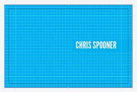 在名片的右边画一个用蓝色填充的矩形,记得把矩形右边的边线与出血区的边线重合。接着,用背景网络模式中的线条选择整体尺寸。使用输入工具在蓝色矩形内 输入你的名字,用你认为最有影响力最吸引人的字体哦。在这里,我使用的是我个人认为非常美观的League Gothic字体,而且白色在蓝色背景中显得突出与漂亮。(图17)