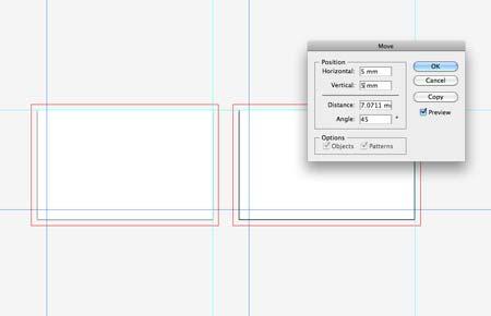 把参考线拖出来,用黑色线条围成名片的边框(按住CMD/Ctrl+R打开尺子,选择底部的水平参考线和两条左边的直立参考线,然后按Enter键打开 Move 窗口。在Horizontal 和Vertical 的选项里输入5mm,点击OK。(图11)