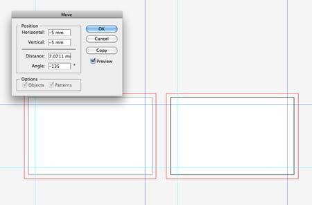 在第一张卡片上画一个覆盖整张卡片的矩形,出血区的线条选用红色。复制粘贴这个矩形,在这个复制的矩形里用之前做好的那个模板样式来填充。当样式复制 好,你将会得到一个无缝的网络样式。(图14)