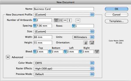 在Illustrator中建立一个新的文件。个人而言,我习惯把名片的大小设为88×55。(图09)不过,名片大小会因为印刷公司的不同而不同,当 然,在美国就是有公制来规定名片尺寸的。进入尺寸设置,根据你的选择调整宽度(width)、高度(height)和名片下面的出血(bleed)。然后 复制把这张卡片制作成双面,同时,Number of Artboards 的选项设为2. 最后,最后检查你的色彩模式(color mode),把它设置为CMYK颜色。(图10)