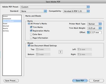 按住CMD/Ctrl和A全选,使用捷径CMD/Ctrl+SHIFT+O把所以字体移到框架里。这样做可以有效防止打印时会出 现相关的字体问题。点击File ,然后是下拉菜单中的Save As and select Adobe PDF。在PDF选项中,在Marks和Bleeds区内选择恰当的打印标记。Trim和Registration标记通常都是最重要的。很多情况 下,Color Bars和Page Information这两项都是留给打印的人最后才做出调整。