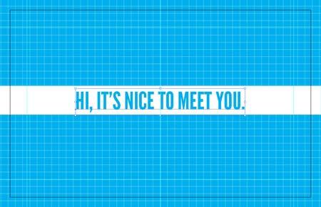 把名字背后的矩形拉长到与名片的宽度同宽,然后用白色填充这个矩形。(图21)拖出其中一条参考线,这样才可以更加精确名片的正中心。用这条参考线来把 这个矩形文本框放在名片的最中心。把字体颜色改为蓝色,别忘了把文本框内的话改为一句很热情的话语。(图22)