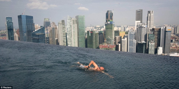 室外泳池其实只是绚丽的船型“空中花园”(SkyPark)的特色景观之一。“空中花园”建在三栋塔楼之上,构成了世界上最昂贵的酒店,即造价40亿英镑的新加坡滨海湾金沙酒店。滨海湾金沙酒店共有2560个房间,每晚的房价是350英镑,于6月23日正式开门营业,美国歌唱家黛安娜-罗斯还在开业庆典上一展歌喉。