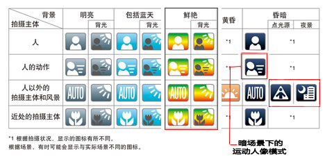 智慧AUTO模式根据人们的使用习惯和使用场合将可能遇到的拍摄情况做了细致的划分,按照人物拍摄、风景拍摄和物体拍摄分成了31种场景模式。使用智慧AUTO模式拍摄时,摄像机根据人物主体信息、距离信息、亮度信息、颜色信息和运动信息综合分析后,会自动切换到相应的拍摄模式,并在液晶屏上显示出相应的图标。