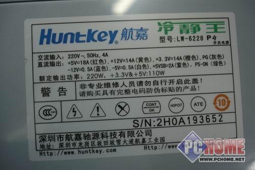 航嘉冷静王标准版2.3版的产品铭牌一览。该电源的额定功率为220W,最大功率为300W,足以应付目前主流的双核平台。这款电源符合Intel ATX12V 2.3规范,采用了单路12V设计。