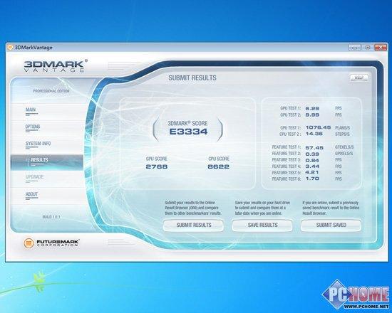 3DMark Vantage主要针对最新高端显卡测试所推出的软件,由于880G主板是入门级显卡平台,所以我们在测试中使用了E级(最低分辨率)进行测试。