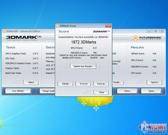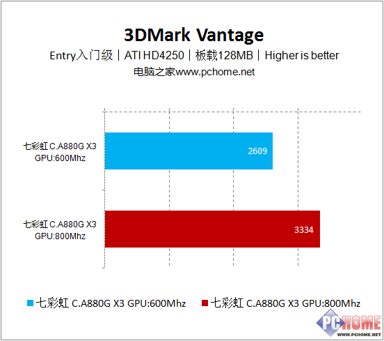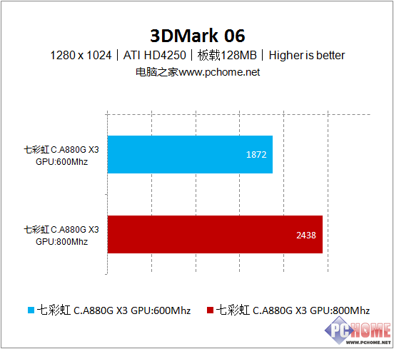 在默认情况下七彩虹C.A880G X3主板集成的HD4250显卡跑出了1872分,这个性能已经可以满足一些网游爱好者的需求,在中偏下的画质下跑魔兽世界,可以满足游戏达到流畅程度, 同时远远超越了Intel酷睿i3 530内部集成显卡;在GPU超频至800MHz(890GX为700MHz)后,分数接近了2500分,超越了低端入门级独立显卡GT210显卡分数及 HD4290显卡,已经可以流畅的运行中端单机游戏。