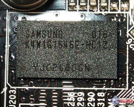 七彩虹C.A880G X3主板板载了一颗三星DDR3 1.2纳秒显存颗粒,理论速度可高达1600Mhz,但是实际测试中由于主板限制,这颗显存最高可设置为1333MHz(主板中显示667MHz),为提升显示性能打下了良好基础。