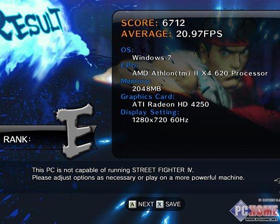 通过平台在街霸四上的测试,我们可以看出,在默认情况下的跑分达到了6712分,平均Fps为20.97分,在打斗不激烈的场面Fps可达到30以上,而在对打中出必杀技的时候,最低Fps骤降至13Fps,画面比较卡,游戏性全无。