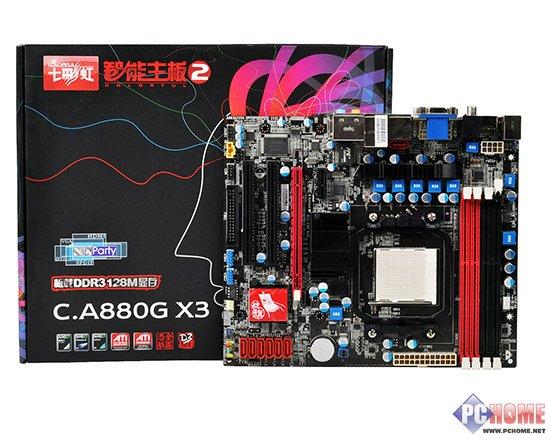 七彩虹C.A880G X3主板基于AMD 880G+SB850芯片组,支持高达5200MT/s的HyperTransport 3.0系统总线,采用MicroATX板型黑色PCB底板全固态设计,内建Radeon HD4250图形核心,并支持iGPU Clock逐兆超频技术,核心频率为600MHz,超过标准的880G主板560MHz的频率,同时还板载了GDDR3 128MB显存,可以带来近20%的3D性能提升。