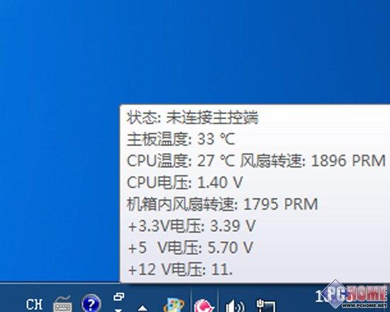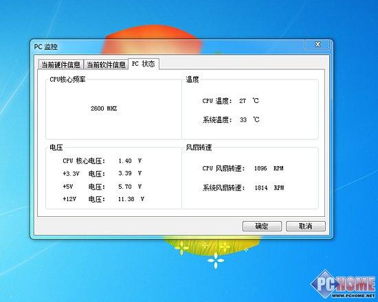 当将上边按钮选至PC状态时,这是我们可以看到更多监控信息,其中系统温度(主板温度)与系统风扇转速(机箱风扇)也被显示出来。