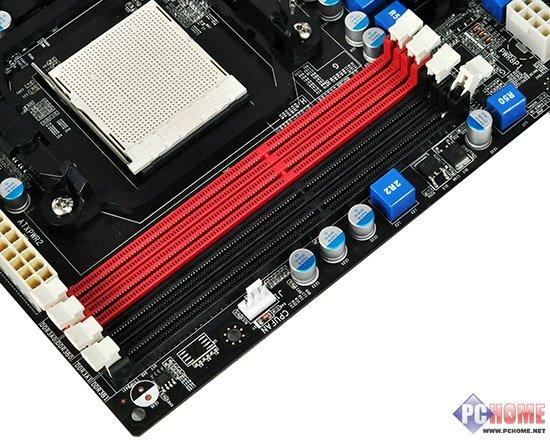 在内存部分,七彩虹C.A880G X3主板提供4个DIMM内存插槽,支持双通道DDR3 1066/1333/1600(OC)内存规格,最大支持16GB内存。供电方面采用了单相供电设计,完全可以满足内存超频至DDR3 1800MHz以上,但是由于AMD内存控制器与CPU外频的限制,并不能像Intel主板那样讲内存提高至更高水平。