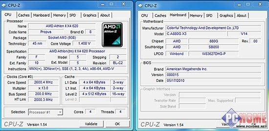 CPUZ中清楚的识别了处理器信息及主板信息,更是在主板信息中清除的标出了七彩虹科技C.A880G X3主板的信息,芯片组AMD 880G,南桥芯片SB850等主板信息,用户在购买后装机时可以清楚的用CPUZ了解到主板真实信息。
