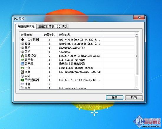 我们打开软件的智能监控选项,弹出一个对话框,里面更佳详细的分成了硬件信息、软件信息与PC状态三个切换条。在当前硬件信息中可以详细的显示出自 己电脑的配置与各个芯片,但我们也发现,在内存这个选项中此款软件并没有正确识别,我们的平台使用的DDR3 1333MHz,而其显示的是DDR2 667MHz,笔者在网上找了很久也没发现此款软件有2010年版,所以在一些新版本的硬件不能被正确识别。
