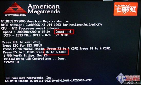 虽然AMD新南桥取消了ACC技术,不过这一点从来难不倒DIY领 域,不少品牌通过加“芯”的方式模拟ACC功能,不过也间接增加不少的成本。不过也有品牌通过巧妙的修改PCB线路实现,如七彩虹8系列主板,该系列主板 支持Smart Core Unlocker一键开核技术。开机轻松按一下F3,F4或F6就可以瞬间让处理器变身3核,4核或6核。而经过测试,通过Smart Core Unlocker新打开的核心超频稳定性良好,当然了,前提是该核心不存在太的瑕疵。