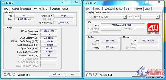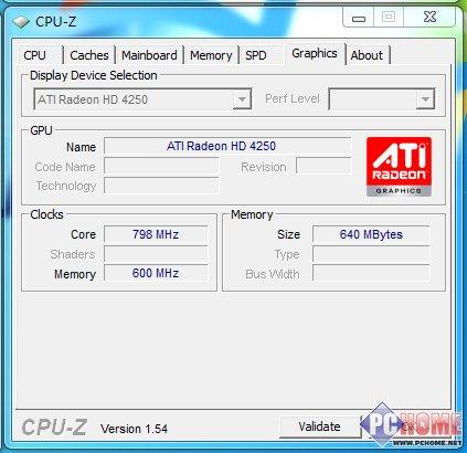 新版的CPUZ软件已经可以准确的识别到880G主板所集成的HD4250显示芯片,核心频率为597MHz(有时候软件会有少许误差),板载显存 频率设计在600MHz(可能是软件并没有真实的认证到显存1333MHz的频率),显存被锁定在了640MB(手动设置512MB加上板载的 128M)。