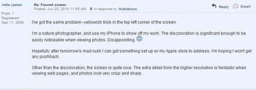 iPhone 4最早曝出的问题是屏幕泛黄,当首批用户陆续接收到iPhone 4之后,很多人都发现iPhone 4的屏幕出现了黄色区域。很快这部分用户就在苹果论坛上进行了讨论,并有媒体进行了报道。