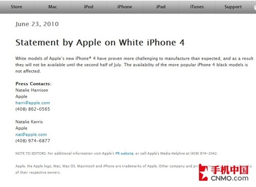 苹果公司6月23日在其官网上表示:白色版iPhone 4手机在制造过程中比之前期望的更具挑战力,因此白色iPhone 4在今年下半年的7月才能推出。不过白色版本的推迟并并不会影响到黑色版本的销售。