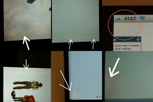 通过不同用户在不同媒体、论坛提供的图片,我们能够发现iPhone 4手机的屏幕的确有黄色区域的出现,甚至有用户反映,他发现手机有黄色区域之后,通过相关应用将屏幕变白之后发现,屏幕上的黄色区域多达五处。